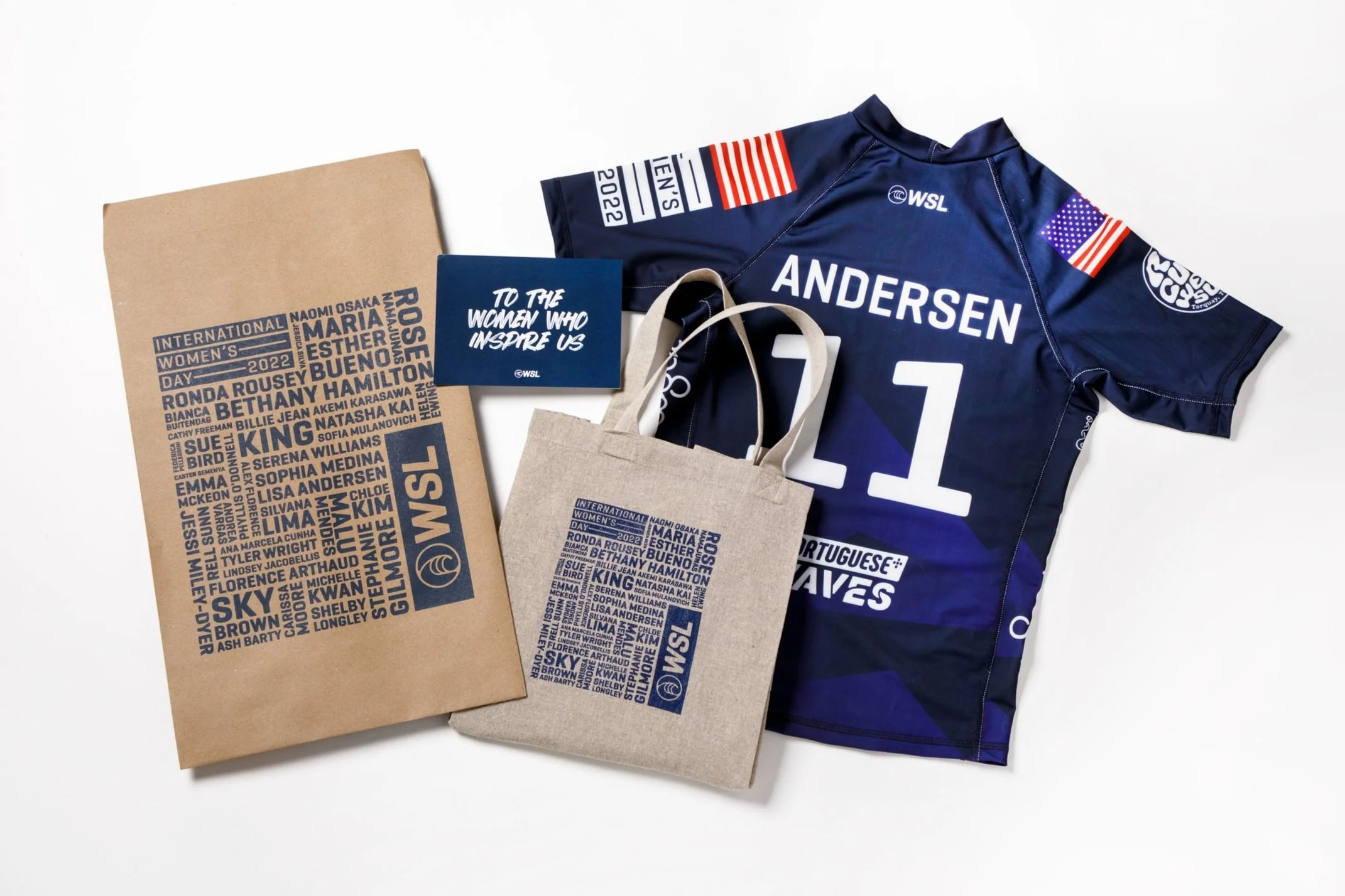 Project contributing to the World Surf League’s International Women’s Day Celebration at the MEO Portugal Pro in March 2022. Each athlete wore a jersey with the name of a women in sport who inspired them, this jersey was then sent to each person. Goal was to create packaging, card, and a gift to send alongside the jersey to the list of 53 amazing women. End result was a lockup with all of the names that was then printed on a 100% recycled craft package and the tote bag.